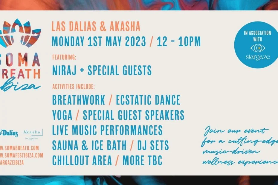 Soma Breath – Las Dalias y Akasha A partir de las 12h Experiencia de bienestar de vanguardia, impulsada por la música. Presentando: Invitados especiales de Niraj Actividades incluidas: respiración danza… Leer más »SOMA BREATH – LAS DALIAS IBIZA